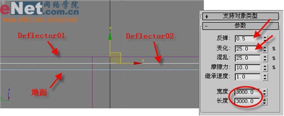 小提示:这个导向板是作为冰雹第一次碰撞后紧接着第二次的碰撞而设置的,因此从高度上要低于Deflector01的位置,即x为0、y为0、z为-5。
