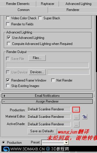 3、与默认的扫描线渲染器相比,此时渲染场景对话框发生了一些变化,如图。