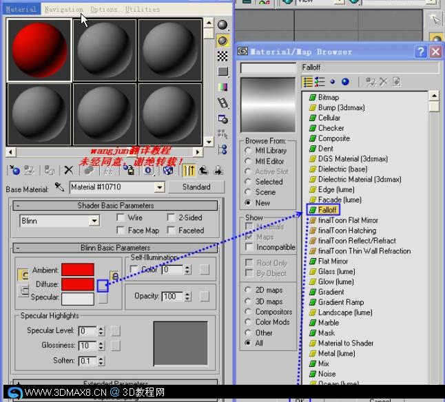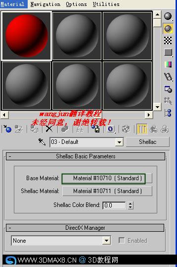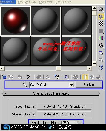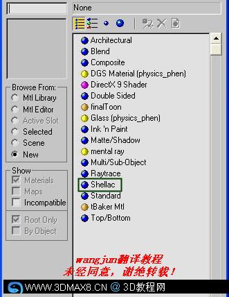 5、从Material Map/Browser对话框中选择Shellac类型,然后点击OK,如图。