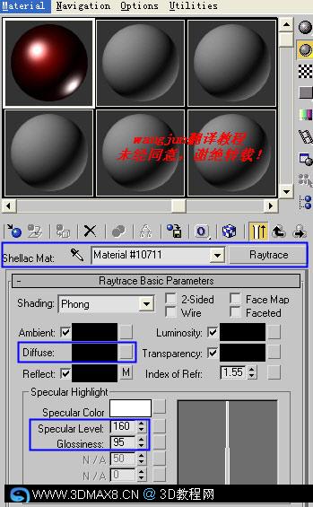 15、返回上一层级,设置Diffuse颜色为黑色,并设置Specular level为160,Glossiness为95,如图。