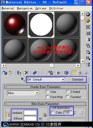 21、返回上一层级,设置diffuse颜色为纯白色,并修改自发光颜色为100,如图。