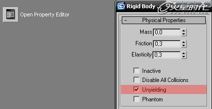 3、选择长方体,打开属性编辑器,勾选Unyielding。(图10)