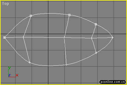 1、利用画线工具画出叶子的线框。布线考虑到了叶脉的走向,这样做出的叶子比较自然。由于叶子基本上与地面平行,所以在顶视图中做省事。顶点基本上都使用Smooth或Bezier Corner方式,另外要注意叶子线框网格应该为三边形或四边形,该重合的点要重合。如图二所示。