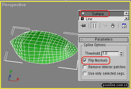 2、给叶子的线框施加一个Surface修改器,从而产生曲面。如图三所示。如果模型看不到,则说明法线反了,勾选Surface修改器参数卷帘中的Flip Normal(反转法线)选项即可。