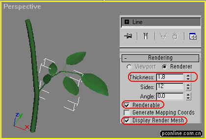 3、其它几片叶子都是复制出来了。再利用调整控制点位置等方法,使叶子稍微出现一些形变等以取得自然的效果。叶子之间的叶柄是用Line直接画出来的。这里笔者没用放样,而是利用3DS MAX R4中的线粗细可在视窗中表现出来、可渲染的特性来做的。在一个视图中画线然后在其它视图中调整这根线上的控制点即可。如图四所示。这是基本功。注意画线时为了正好能使线的端点与叶子的一段相接,可以打开三维捕捉(3D Snap)的顶点(Vertex)捕捉方式。