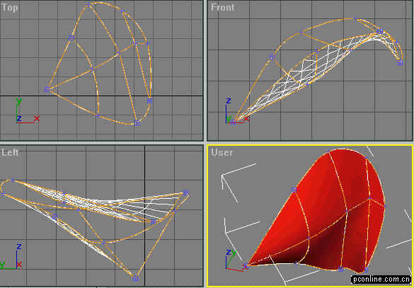 3、再复制出第二层的花瓣。调整好。注意第二层的花瓣要高一些,不象第一层花瓣那么平。在三个正视图中反复调整Surface模型中的线框中的顶点的位置,尽量模拟出花瓣的卷边效果,这样才真实可信。然后再用第二层复制出第三层,再对第三层进行微调。一定要注意各个花瓣之间不能交叉,要有所变化,不可千篇一律。如图九所示。要不怕调整点的麻烦,你的付出与你的劳动成果是成正比的。