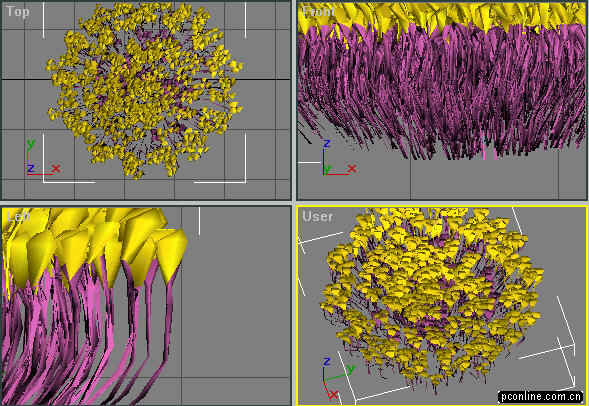 花蕊的制作也不能马虎。但是制作起来是很麻烦的事情。笔者选中的是复合体Scatter制作的方法。为了达到逼真的效果,一个花蕊就费了3万多个三角面(不过可以用MultiRes修改器优化面数)。Scatter的使用是基本功了,在此不再详述。如图十一所示。