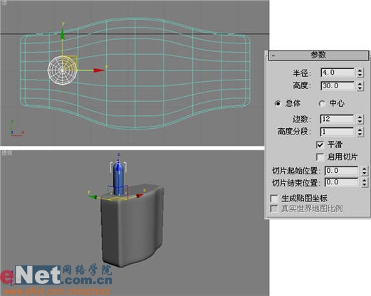 10、选中cylinder01,单击“修改”命令面板,在“修改器列表”下拉框中选择“编辑网格”项,点击“顶点”按,在视图中框选底部的顶点,并将其拖动到如图10所示的位置。