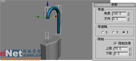 9、选中cylinder01,单击“修改”命令面板,在“修改器列表”下拉框中选择“bend”项,并进入其参数卷展栏修改弯曲度,如图9所示。