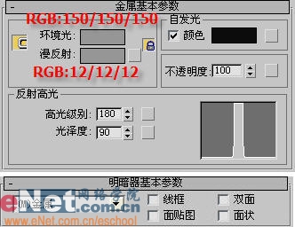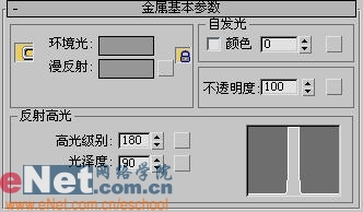 4、点击工具栏上的“材质编辑器”按钮,打开其面板,选择第二个样球,打开“明暗器基本参数”卷展栏,在下拉列表中选择“金属”项,打开“金属基本参数”卷展栏,修改相关值,如图15所示。