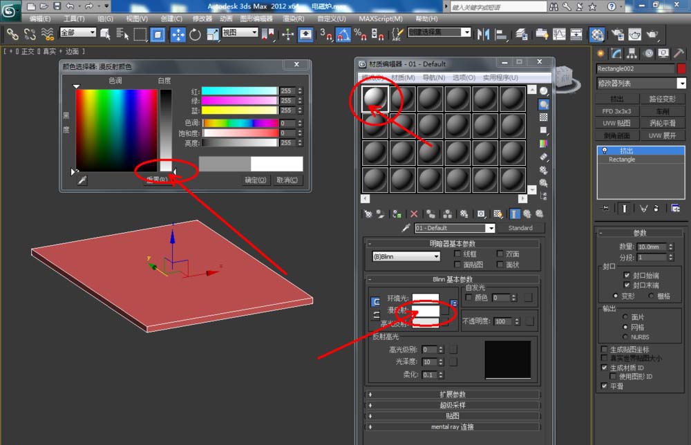 1、打开3Dmax2012软件,点击【创建】-【图形】-【矩形】,在作图区域绘制一个矩形图案并按图示设置好矩形图案的各个参数。选中图案,点击【修改】-【挤出】挤出数量设置为:10mm;