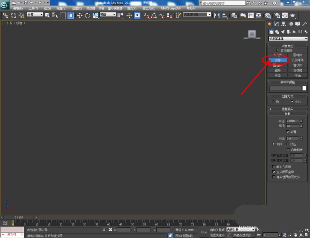 1、打开3Dmax2012软件,点击【创建】-【几何体】-【球体】,在作图区域绘制一个球体模型并按图示设置好球体模型的各个参数。选中模型,点击【对象颜色】将模型的对象颜色设置为:白色;
