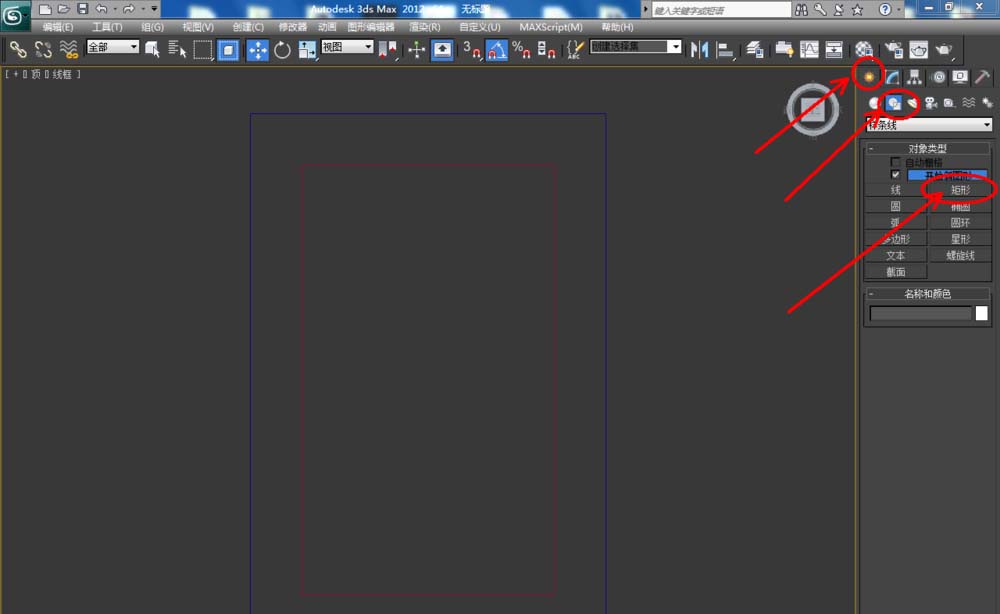 1、打开3Dmax2012软件,点击【创建】-【图形】-【矩形】,在作图区域绘制一个矩形图案并按图示设置好矩形的各个参数。选中图案,点击【修改】-【挤出】,挤出数量设置为:100;