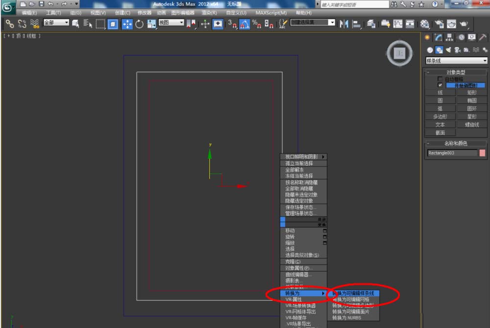 2、点击【矩形】,按图示继续绘制一个矩形图案后,点击鼠标右键-【转换为】-【转换为可编辑多边形】。点击右边工作栏中的【样条线】,框选图示样条线后,鼠标向上拉动【轮廓】右边的小三角图案进行轮廓处理(如图所示);