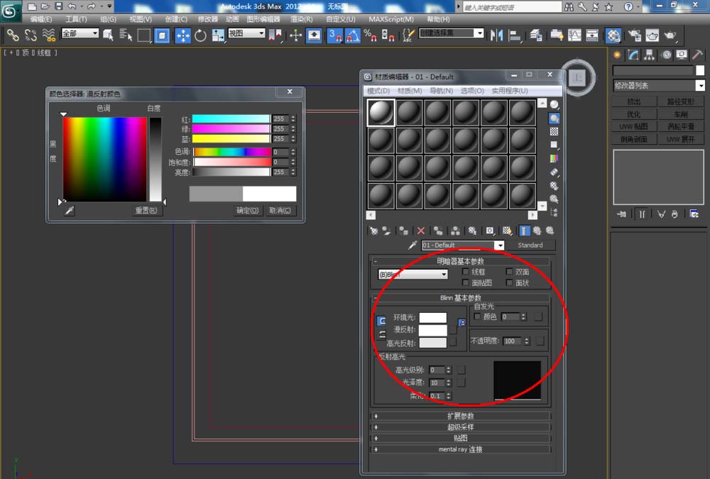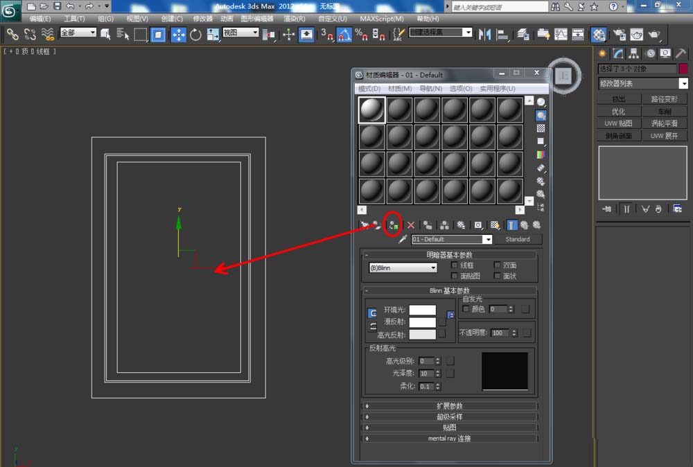 5、点击【材质编辑器】弹出材质编辑器设置栏,按图示设置一个白色材质球并附加给造型天花模型。点击【创建】-【摄像机】-【目标】,按图示设置好一个目标摄像机后,切换到相机视图,点击【渲染】将制作好的造型天花模型渲染出图即可。