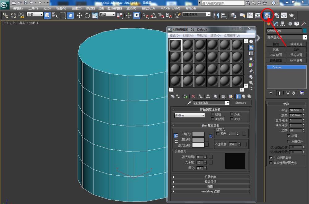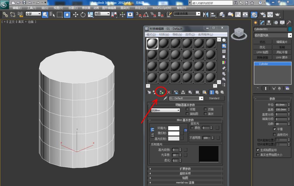 4、选中圆柱体,点击【将材质指定给选定对象】将材质附加上去,这样我们圆柱体模型就制作完成了。