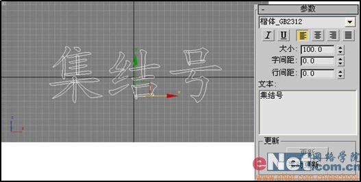 1、启动3dmax9.0,单击“创建”命令面板,点击“图形”创建面板,点击“文本”按钮。在前视图中绘制一文字Text01,并适当调整其大小等参数,如图1所示。