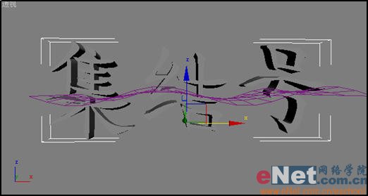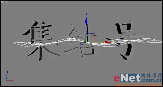 4、选中Text01,单击工具栏上的“绑定到空间扭曲”按钮,然后选择视图中的Wave01,此时文字就产生了波浪起伏的效果,如图4所示。