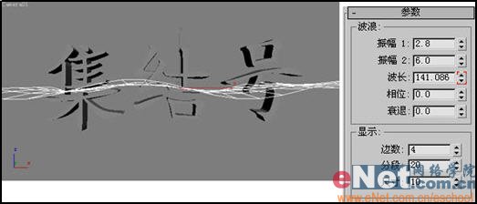 小提示:“振幅1”和“振幅2”值分别用来定义波浪中间和两边的振幅;“波长”值用来设定波浪的波长;“显示”栏中的参数用来设定波浪在视图中的显示模式,与最终渲染效果无关。
