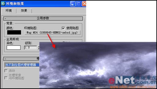 2、点击“渲染”菜单中的“环境”命令,打开其窗口,启用环境贴图,并为其指定一天空图片,如图8所示。