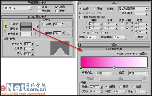 4、点击第二个样球,打开“贴图”卷展栏,单击“漫反射颜色”后的“none”按钮,打开“材质/贴图浏览器”面板,选择“新建”单选项,然后在左边列表中双击“渐变坡度”贴图,如图13所示。