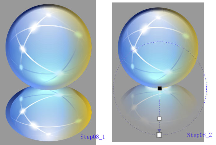 选中全部已经绘制的对象,镜像复制到下方,并适当缩小纵向尺寸,使倒影有点纵深感。把倒影放在最后面,并往上稍稍移动一点距离。 到这里,可以加上一个矩形的背景了,其灰度为40%。用灰色的背景,更能衬托出水晶球色彩的鲜艳梦幻。 [Step08_1]
