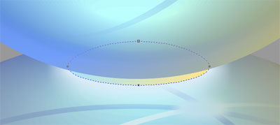 现在的水晶球还没有在地面上放稳。 在水晶球的后面底部画一个椭圆(R165 G228 B255到R255 G230 B142的线性渐变填充)。给它应用一个自发光阴影效果,属性为:下拉阴影方向——向外;下拉阴影不透明度——100;下拉阴影羽化——50;下拉阴影颜色——R220 G236 B247。 [Step09]