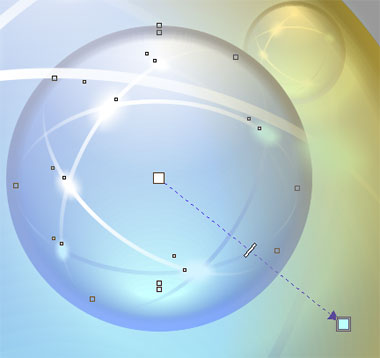 呵呵,到现在,水晶球的样子已经很象那么回事了。接下来是制造梦幻的步骤。 原地复制水晶球的轮廓圆形,并放在所有对象的前面。将其填充为白色。 应用交互式透明工具如图所示。注意中间哪个控制点是10%的灰度而不是纯粹的白色,这样会显得更自然一些。