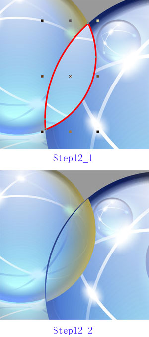 仔细地框选不大不小水晶球的球体部分,将其群组。为了验证确实选到了整个球体而没有或多或少,在选中后移动它一下以便观察,确认后Undo便是。 原地复制球的群组。 选择“效果——超级裁剪——放置于容器内…”(Effects——PowerClip——Place Inside Container…),用出现的大箭头单击前面相交出的树叶形曲线,将球群组放置于容器内。