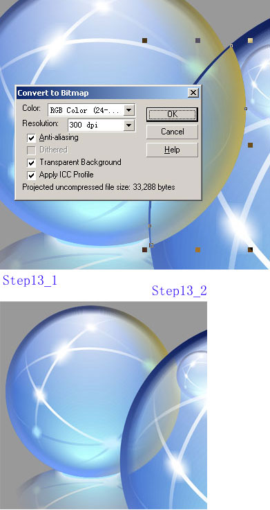 下面会用到本作品唯一的一次位图处理功能。 保持前一步做出的东西的选中。应用“位图——转化为位图”(Bitmap——Convert to Bitmap…),在弹出的对话框中做如下设置: [Step13_1]