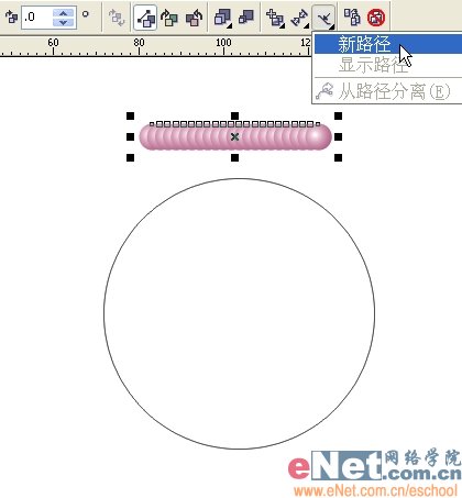 4、用椭圆工具画一个椭圆作为新路径。用交互式调和工具选中珍珠,在属性栏上点“新路径”,鼠标会变成弯曲的箭头状。