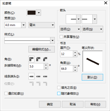 2. 点击“轮廓笔”工具,快捷键“F12”(如果在CDR X8工具箱中没有,可点击快速自定义,展开轮廓笔工具栏)。在“书法”属性中设置“展开”和“角度”数值,该命令针对断开曲线,可以以书法字体的感觉创建粗细不均的轮廓和旋转倾斜角度,以实现轮廓线的粗细变化。