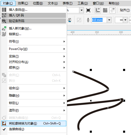 1. 在选择曲线段的状态下,执行“对象>将轮廓转换为曲线”命令(快捷键‘Ctrl+Shift+Q’),如图所示。