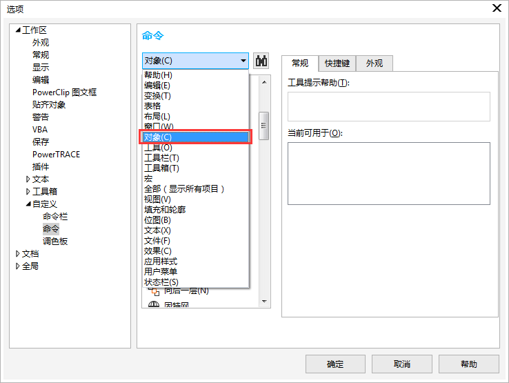 2. 在弹出的“选项”对话框中,单击“命令”选项,右侧展开“命令”子面板对话框,点击展开命令下方小三角图标,选择“对象”选项,如图。
