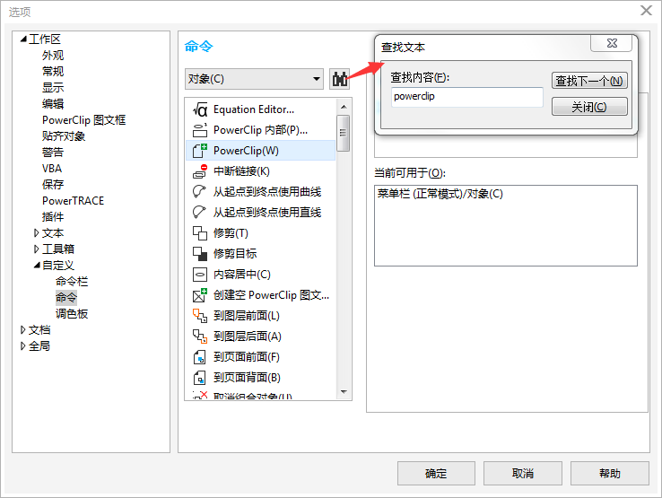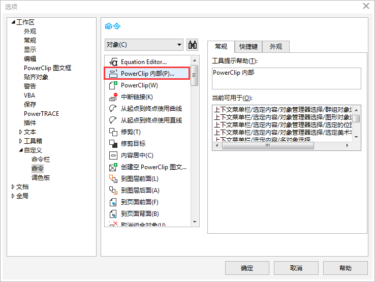 3. 在对象下拉菜单中找到你要自定义的工具,这里以“PowerClip”及相关拓展工具为例。