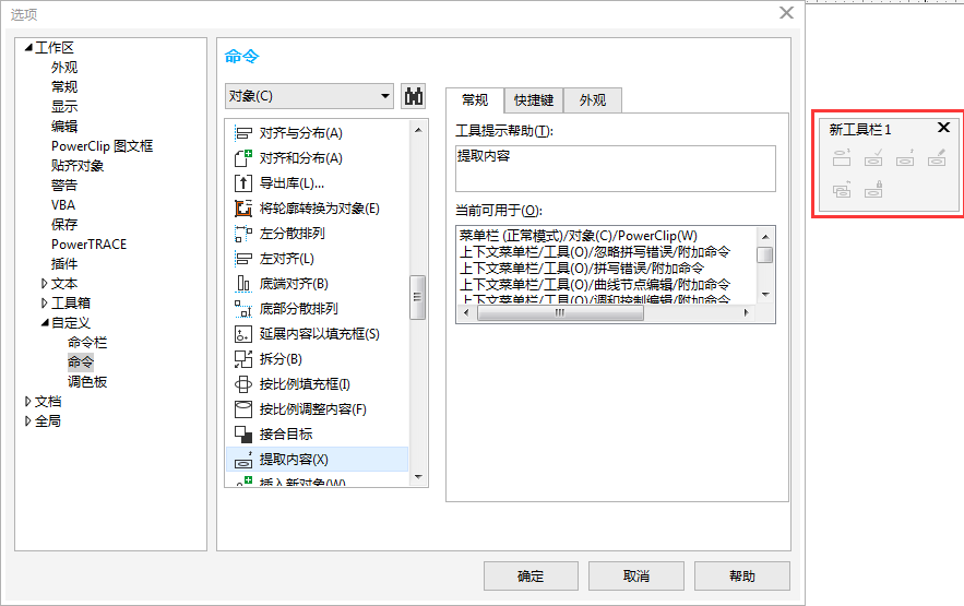 4. 将刚找到的“PowerClip”相关工具逐一拖出对话框外(一定要在对话框外部)并排放在一起,形成新的工具栏。然后点击确定按钮。