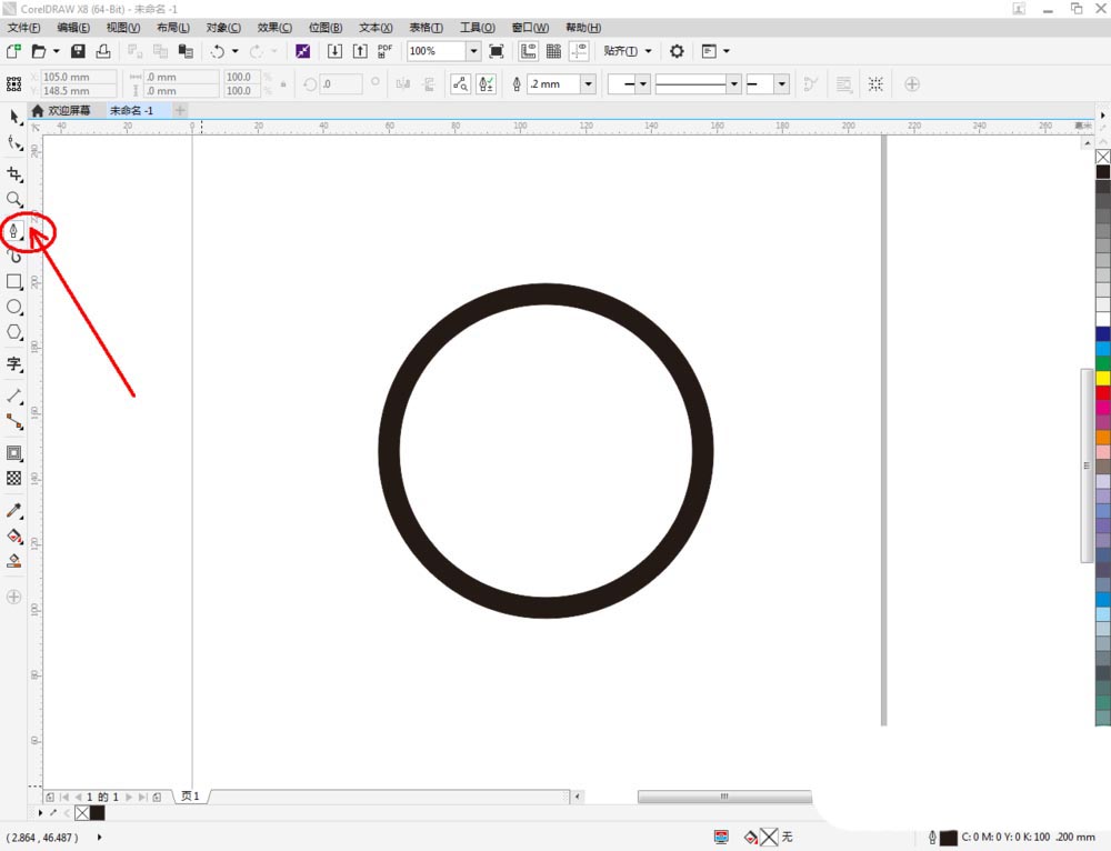 2、点击【椭圆形工具】在作图区域绘制一个圆形图案。点击【轮廓图】拉动圆形图案进行轮廓处理后,点击鼠标右键-【拆分轮廓图群组】将图案拆分(如图所示);