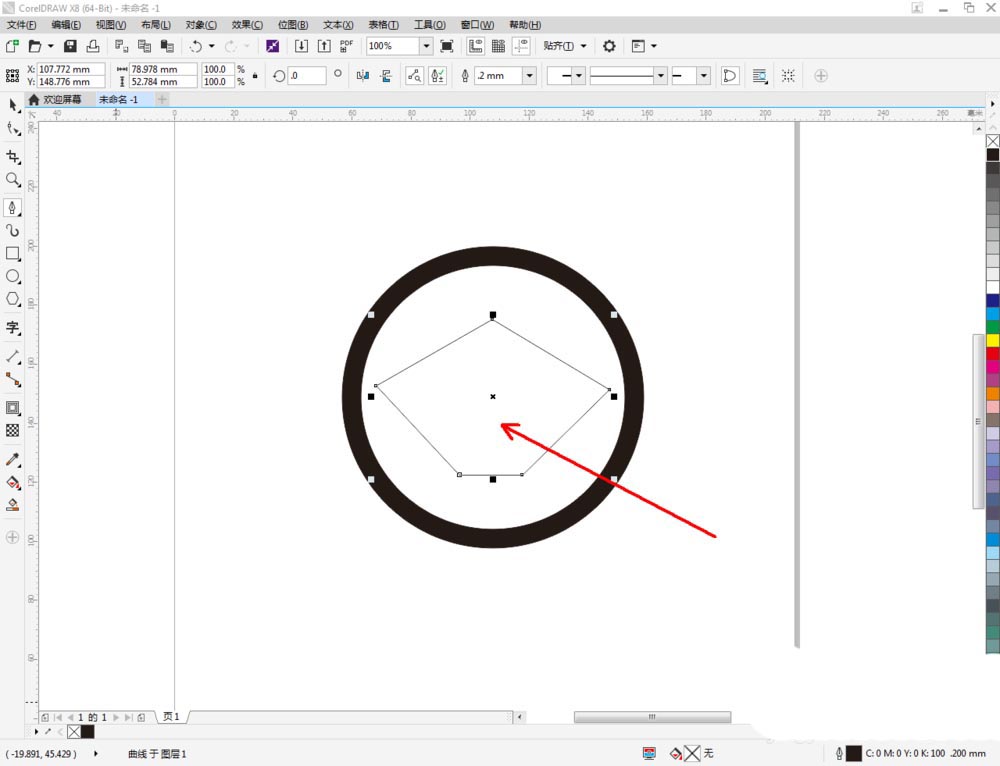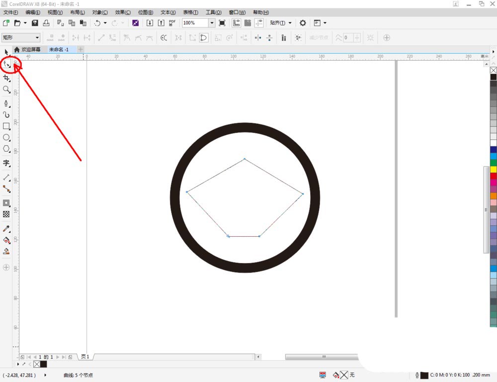 4、点击【钢笔工具】按图示绘制一个多边图案。点击【形状工具】框选图示图案上的所有节点后,点击【转化为曲线】将节点转曲。完成后,选中图示图案上的节点,点击【平滑节点】将节点进行平滑处理并调整好控制点(如图所示);