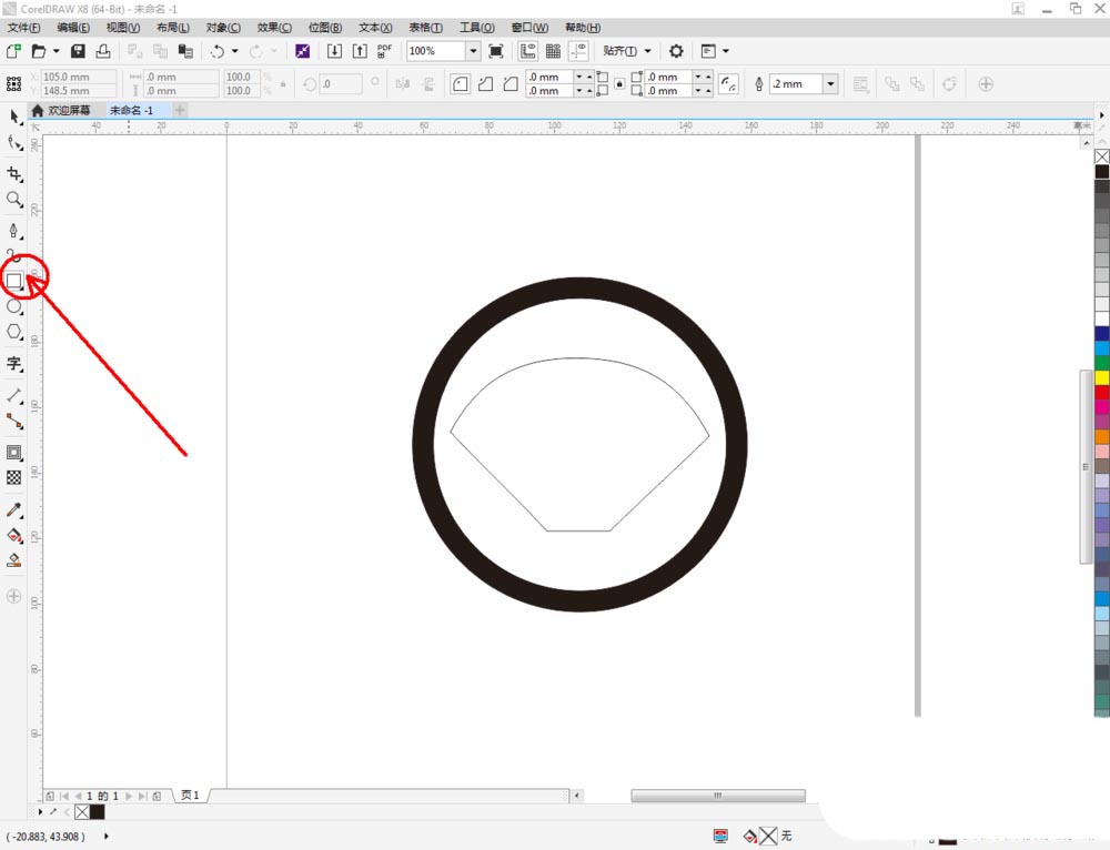3、点击【选择工具】框选所有图案后,点击【移除前面对象】将前面的圆形图案部分移除。完成后,鼠标左键点击右边色板中的黑色色块,将图案填充为黑色(如图所示);
