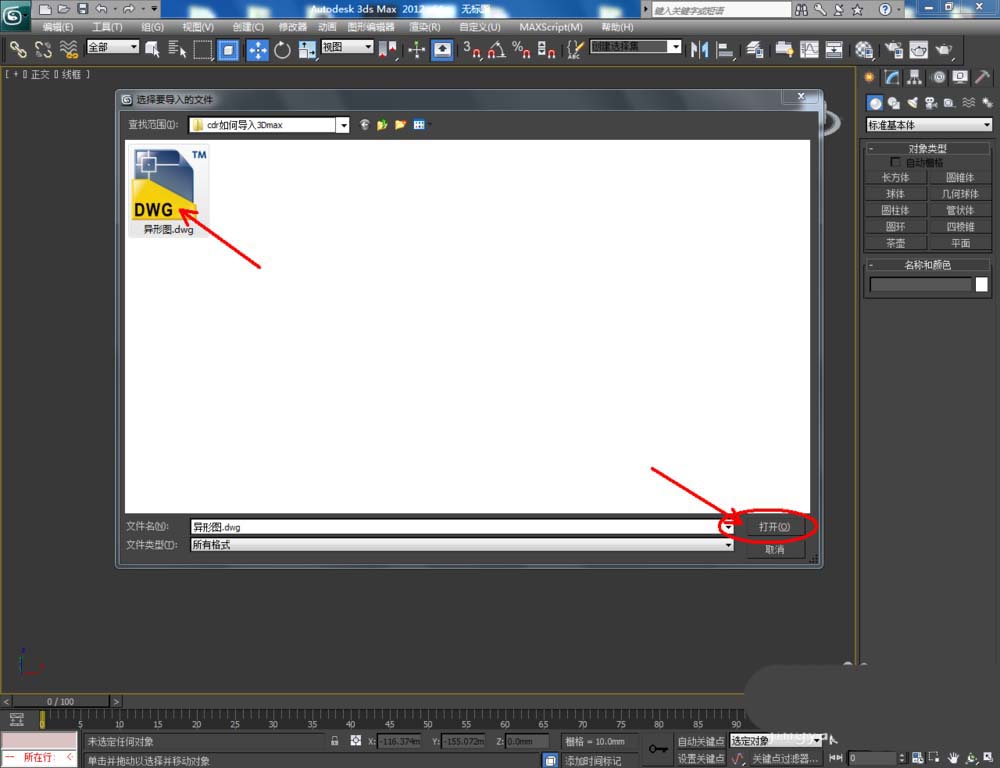4、打开3Dmax2012软件,点击【文件】-【导入】,弹出导入设置栏后,按图示设置好导入文件的各个参数,完成dwg文件的导入操作;