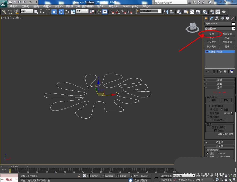5、导入后的图案,我们可以对其直接进行建模操作。选中图案,点击【修改】-【挤出】,按图示设置好挤出数量并为其附上材质后,我们的图案模型就制作完成了。