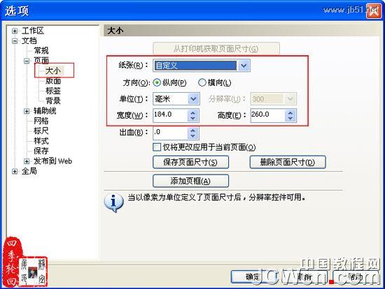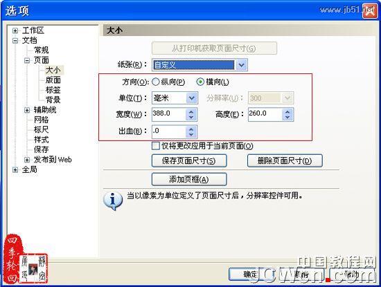 1、设计书籍封面。打开CorelDRAW x4应用程序,然后选择“文件”/“新建”命令,得到一个A4尺寸的纵向默认页面,再选择“版面”/“页面设置”命令,打开“选项”对话框,参数设置如图01所示: