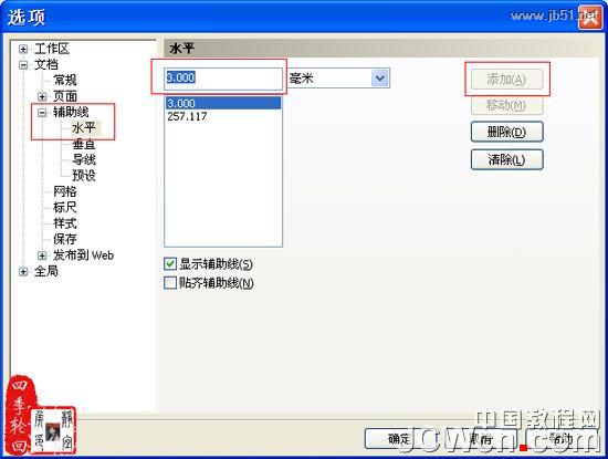 3、选择“工具”/“选项”命令,打开其对话框,然后单击辅助线前面的“+”号按钮,在打开的选项中选择“水平”项目,在数值框中输入“3.000”,并单击“添加”按钮,添加一条水平数值为“3”mm的辅助线,参数设置如图03A所示: