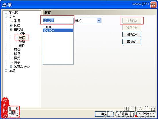 单击“确定”按钮,接着切换至“垂直”选项,添加一条数值为“181.080”的垂直辅助线,最后单击“确定”按钮,效果如图03B所示: