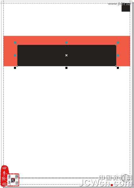 将其移动到合适的位置,选择红色的矩形图形,然后按住下方的控制点往下拖动,增大图形的高度,并将其垂直移到页面下方,按 “Ctrl+PageDown”向下移一层快捷键,效果如图15B所示: