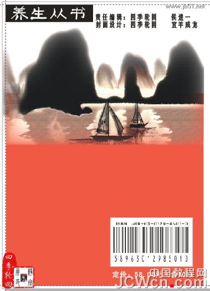 在工具箱中选择“文本工具”,分别输入字体“定价:58.00元(含1CD)”;责任编辑:四季轮回 侯进一;封面设计:四季轮回 宜羊成龙。字体分别“黑体”字号为:“18Pt”;“方正姚体”,字体大小为“14Pt”,并分别填充为“白色”和“黑色”,效果如图17B所示:
