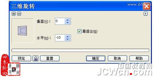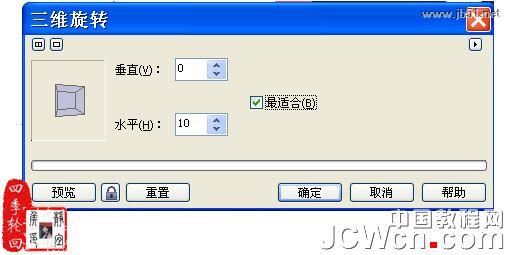 22、选择位图的封面,再选择“位图”/“三维效果”/“三维旋转”命令,打开其对话框后,设置垂直旋转为0、水平旋转为10,参数设置如图22A所示:
