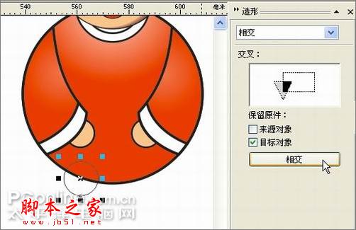 20、选择菜单排列/造型/造型,打开造型面板。选中四边形,在下拉选项中选择相交,点相交按钮,再点一下嘴巴,得到相交部分。