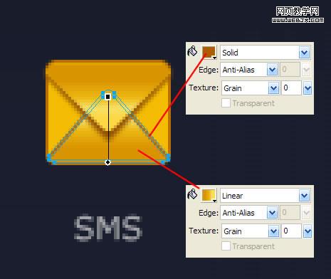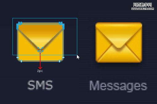 用白色箭头选中途中所示那些节点,然后用键盘的方向键往下挪两个像素,这样使信封看起来长一点(因为这里单个图标不受整体风格约束)。