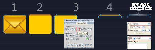 我们选中并复制最底的圆角矩形两次,移动位置后得到两个上下相隔2px的圆角矩形,用两个矩形路径相减的方法得到一个新的路径,对其进行Ellipse填充(白色0-100透明度),最后把这个高光路径的叠加方式设置为Overlay。
